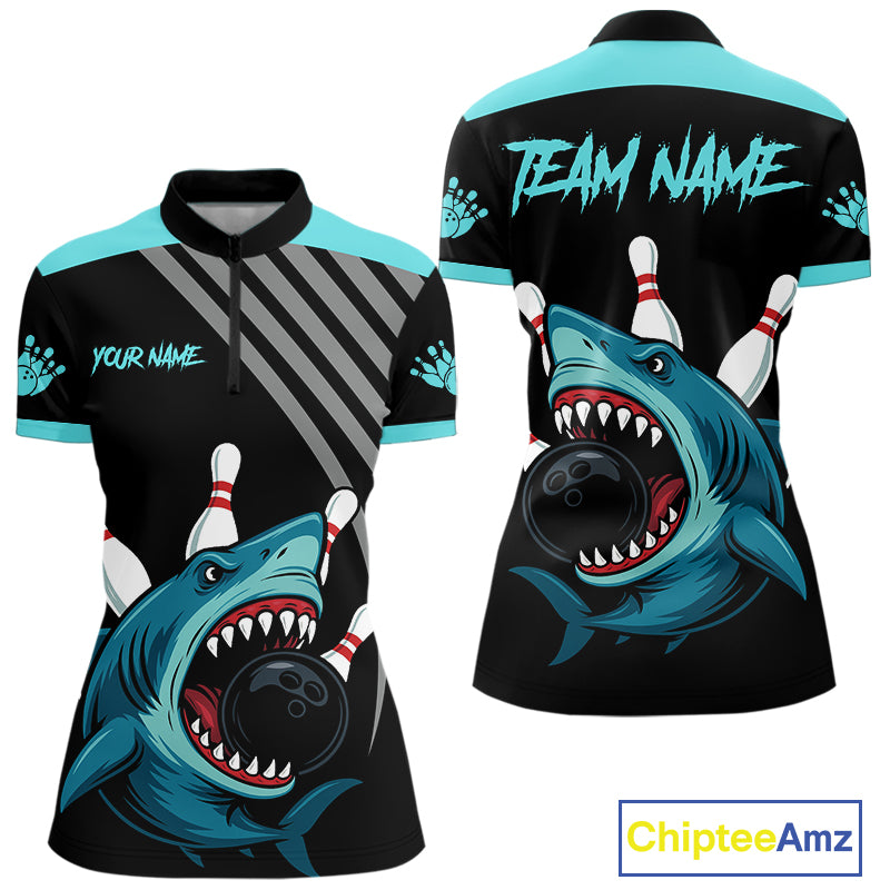 Funny Cyan Blue Shark Women Bowling Polo, Quarter Zip Shirts Custom Team Shark Bowling Outfit Jersey NQS11042