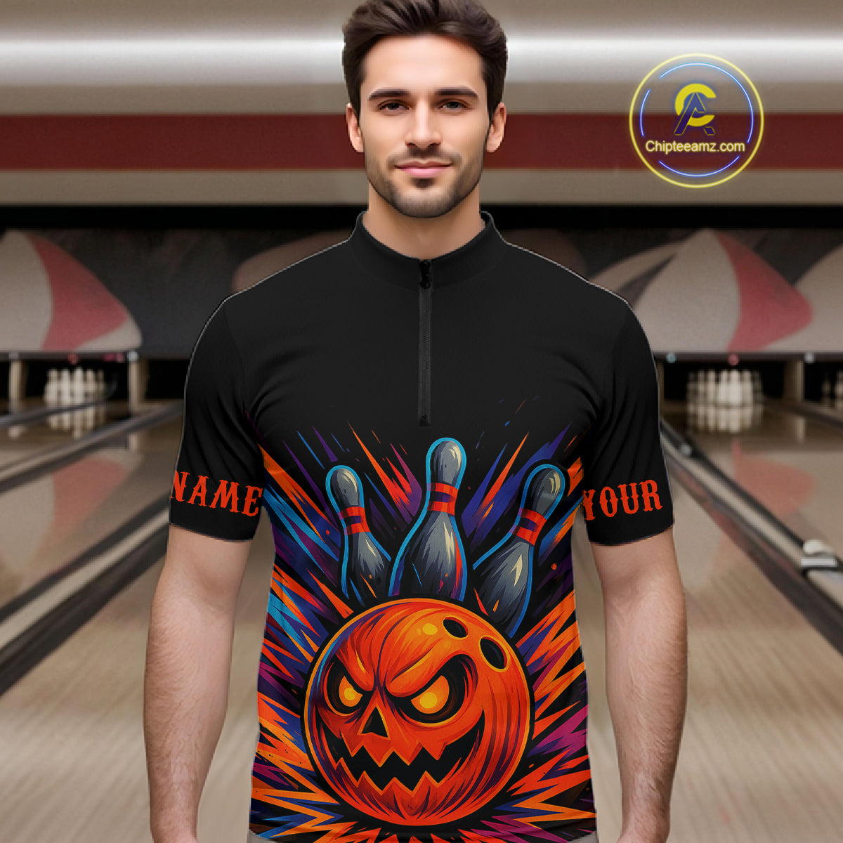 Funny Orange and Black Pumpkin Halloween Bowling Polo, 1/4 Zip Shirts For Men, Bowling Team Jersey NQS10470