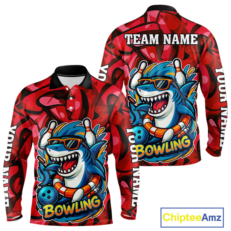 Funny Red Camo Shark Men Bowling Polo, Quarter Zip Shirts Custom Team Shark Bowling Outfit Jersey NQS10076