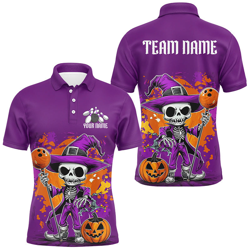 Custom Purple Funny Halloween Skeleton Bowling Shirts For Men, Bowling Team Outfits IPHW7650