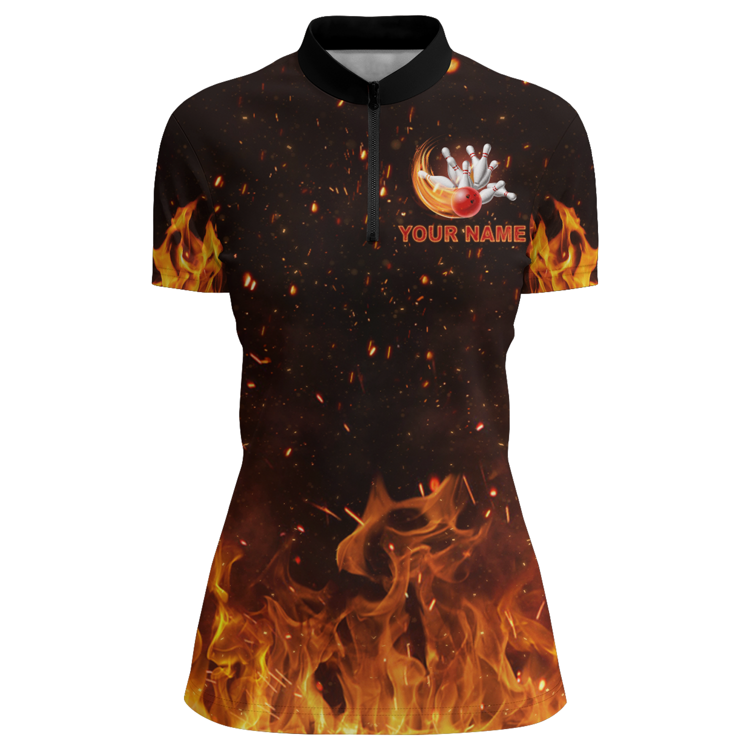 Personalized Women's Bowling Team Shirt Flame Bowling Jersey Custom Funny Bowling 1/4 Zip Shirt BDT330