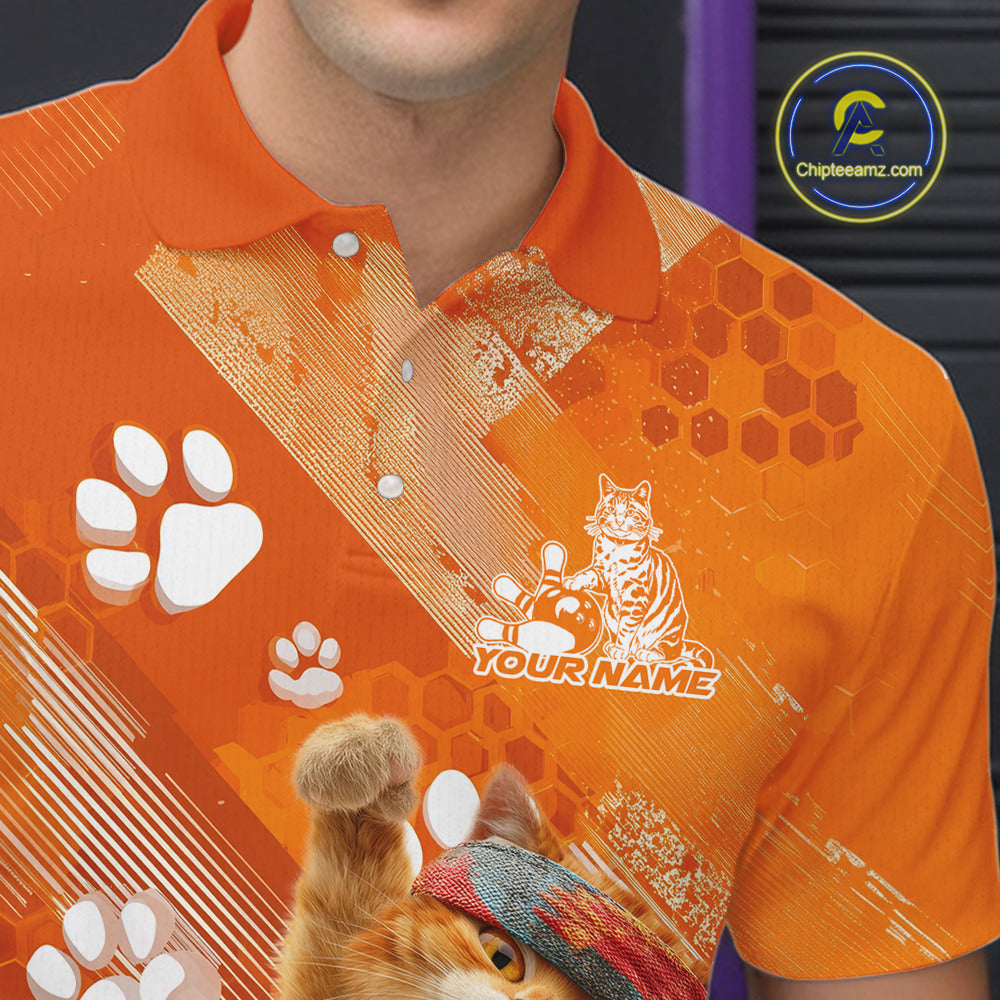 Custom Funny Orange Cat Bowling Men Polo Shirt, Cute Team Cat Paw Bowling Shirt IPHW10102