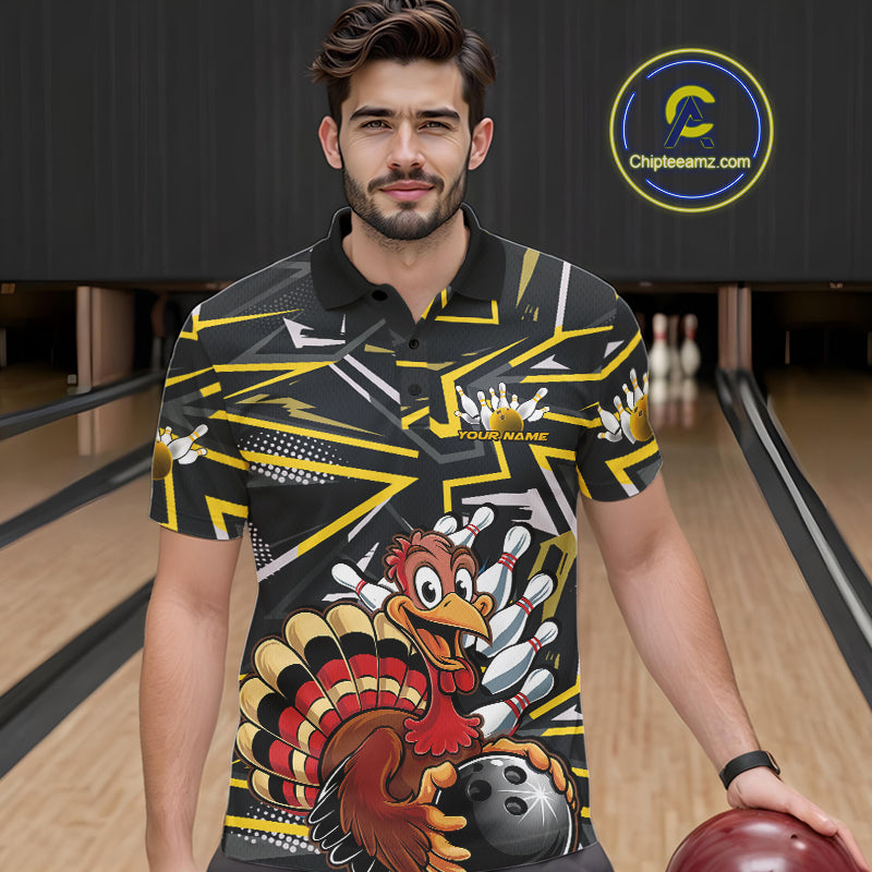 Custom Funny Turkey Bowling Jerseys, Yellow Thanksgiving Bowling Team Men Polo Shirt IPHW9722