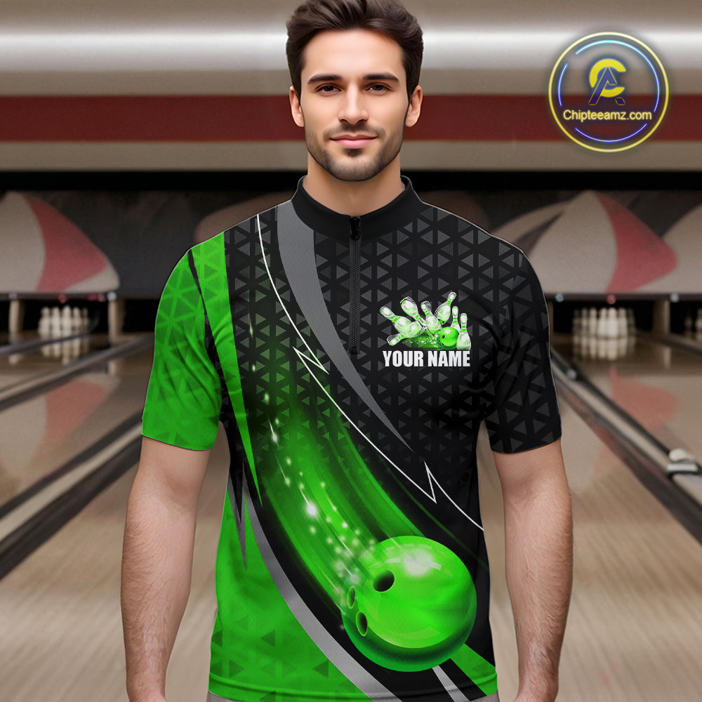 Black and Green Bowling Camo Polo, 1/4 Zip Shirt for Men Custom Team Bowling jerseys, Bowler Outfit NQS10425