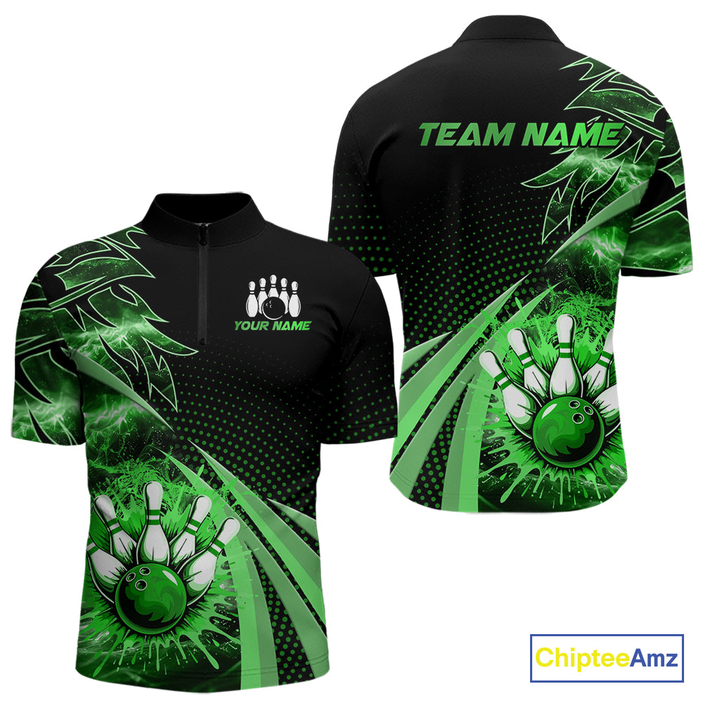Black and Green Bowling Polo, Quarter zip shirts For Men Custom Team Bowling Jersey, Gift For Bowlers NQS10787