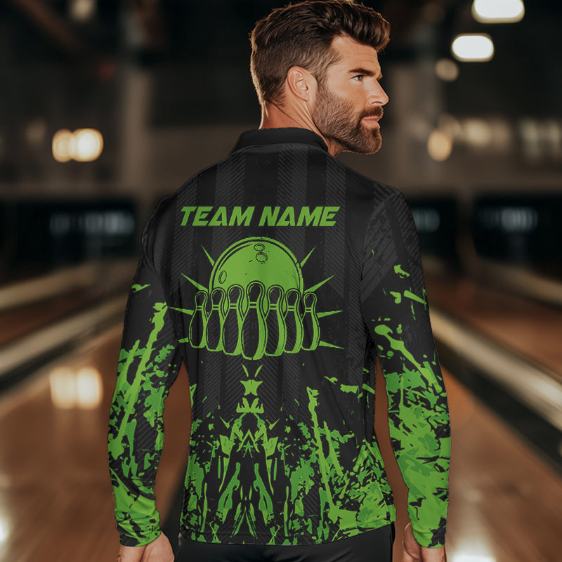 Black and Green Camo Bowling Team Shirts For Men Custom Bowling Uniform Polo, Quarter Zip Shirts NQS9665