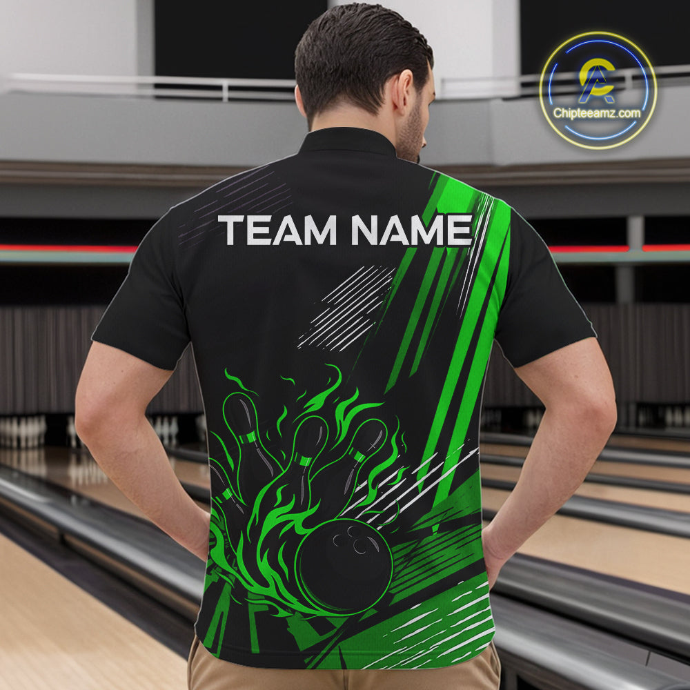Black and Green Flame Bowling Polo, Quarter Zip Shirts For Men Custom Bowling Outfit Team Jerseys NQS10193
