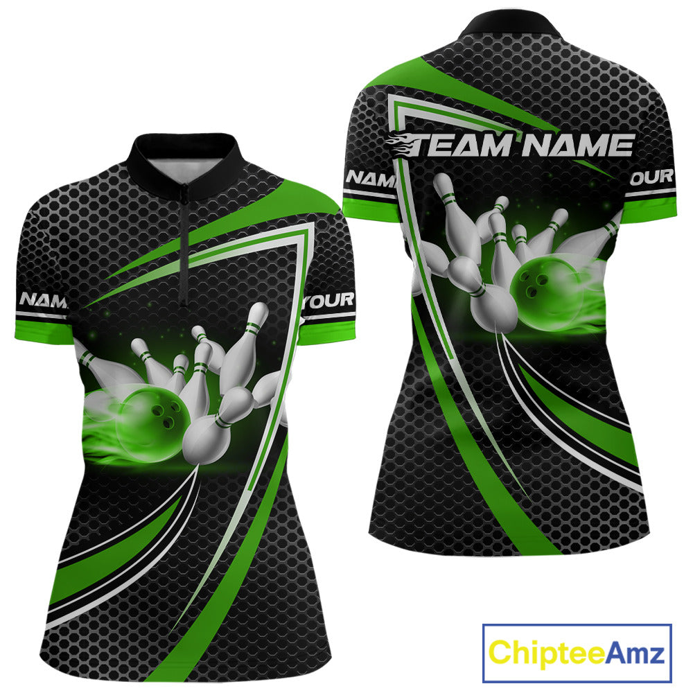 Black and Green Flame Bowling Shirts For Women Custom Team Bowling Jersey, Gift For Bowlers NQS10858