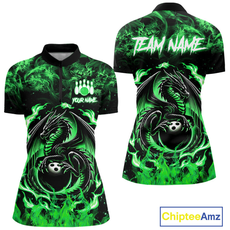 Black and Green Flame Dragon bowling shirts for Women Custom Bowling Team Jersey, gift for Bowler NQS10246