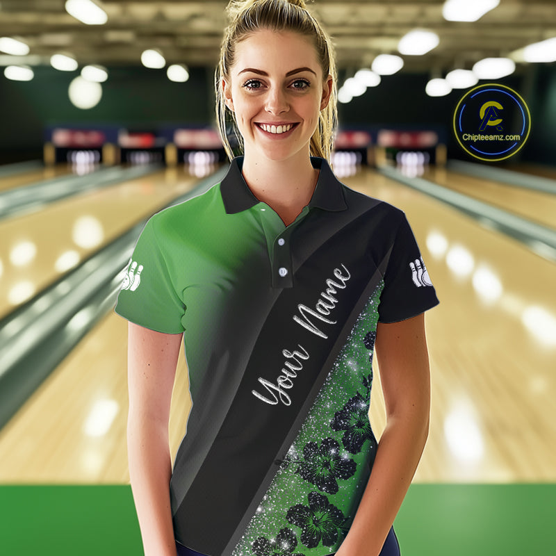 Black and Green Glitter Flower Bowling Polo, Quarter Zip Shirt for Women Custom Bowling Team Jerseys NQS10384