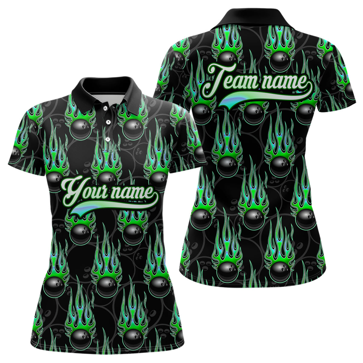 Black Bowling Ball Camo Green Flame Bowling Polo, 1/4 Zip Shirt for Women Custom Bowling Team Jersey NQS9479