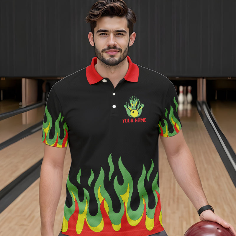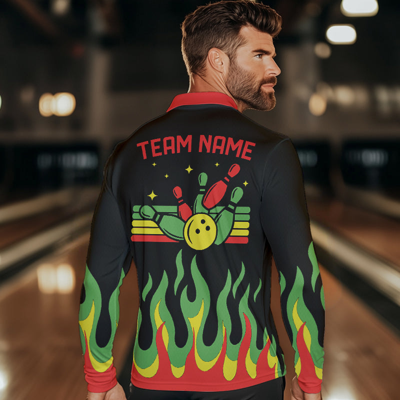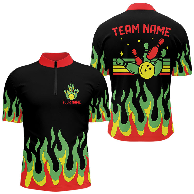 Black, Green and Red Flame Retro Bowling Polo, Quarter Zip Shirt for Men Custom Bowling Team Jerseys NQS9426