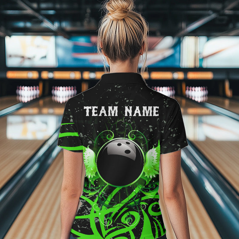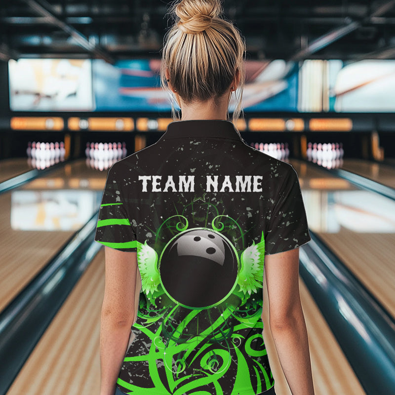 Black & Green Camo Bowling Polo, Quarter Zip Shirt For Women Custom Team Bowling Jersey bowler outfit NQS9418