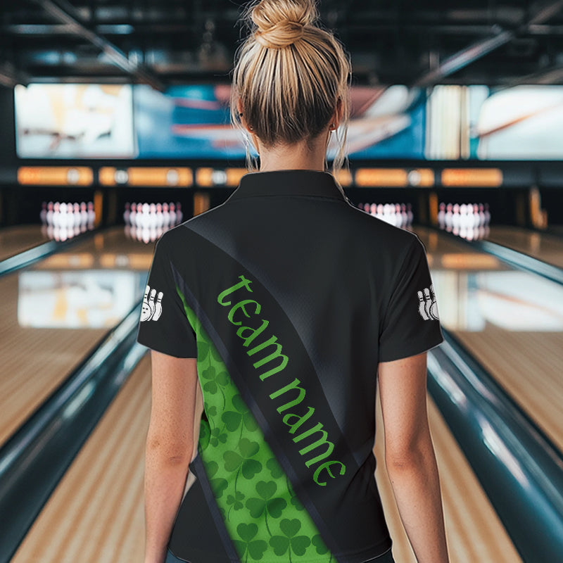 Black & Green Shamrock St Patrick Day Bowling Polo, 1/4 Zip Shirt for Women Custom Bowling Team Jersey NQS9434