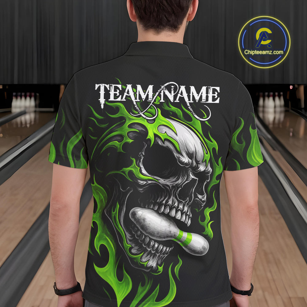 Custom Black and Green Flame Skull Bowling Shirts For Men, Personalized Skull Team Bowling Jersey NQS10793