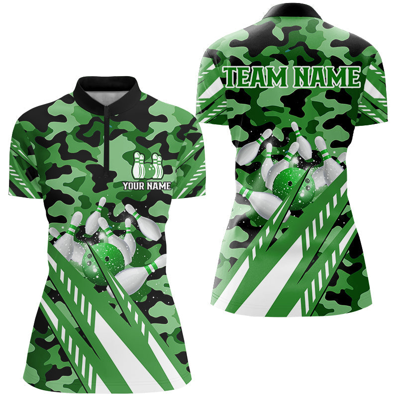 Custom Green Camo Bowling Shirts For Women, Personalized Bowling Team Jerseys NQS8609