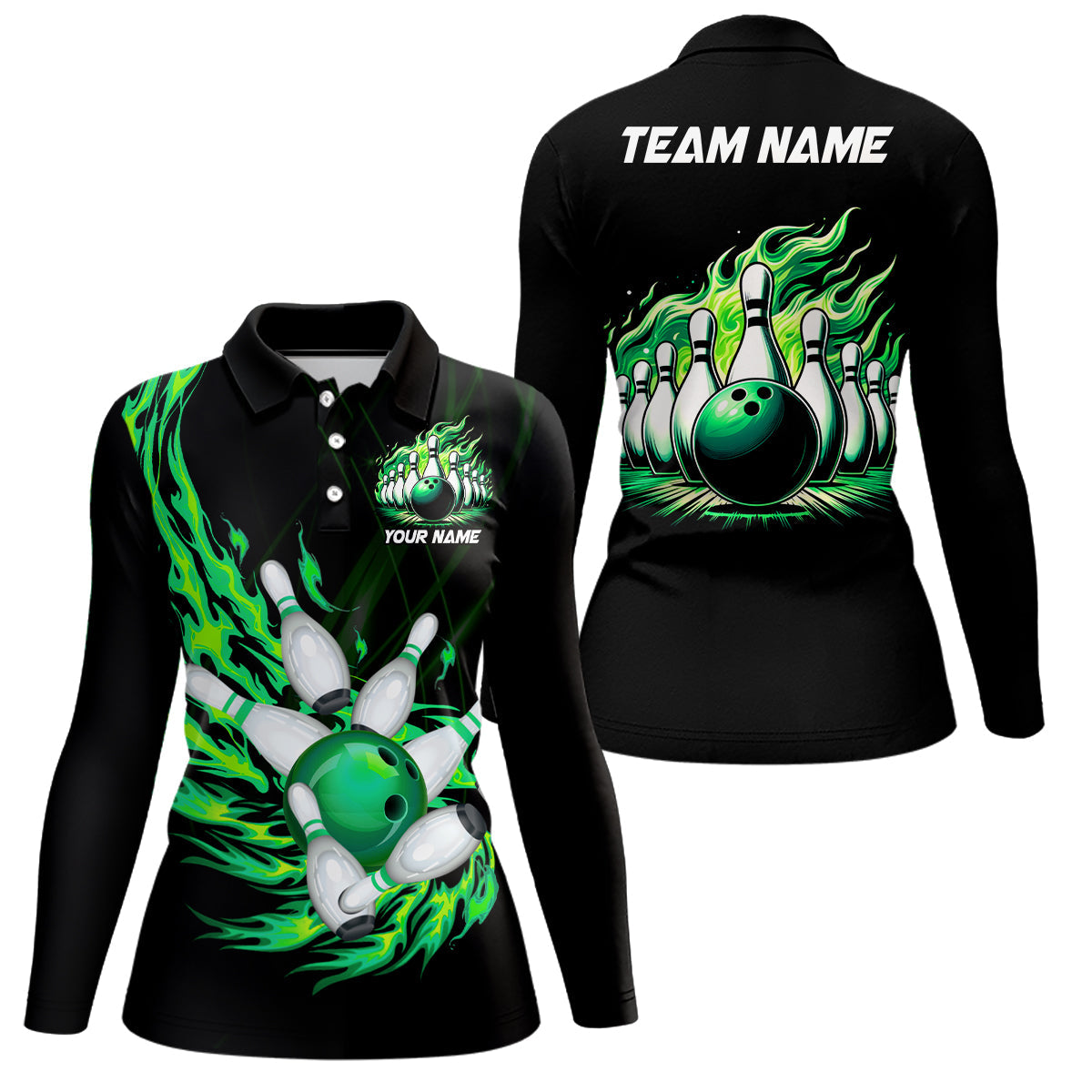 Green flame bowling ball and pins custom Womens Bowling Polo Shirts, team ladies bowling jerseys NQS7516