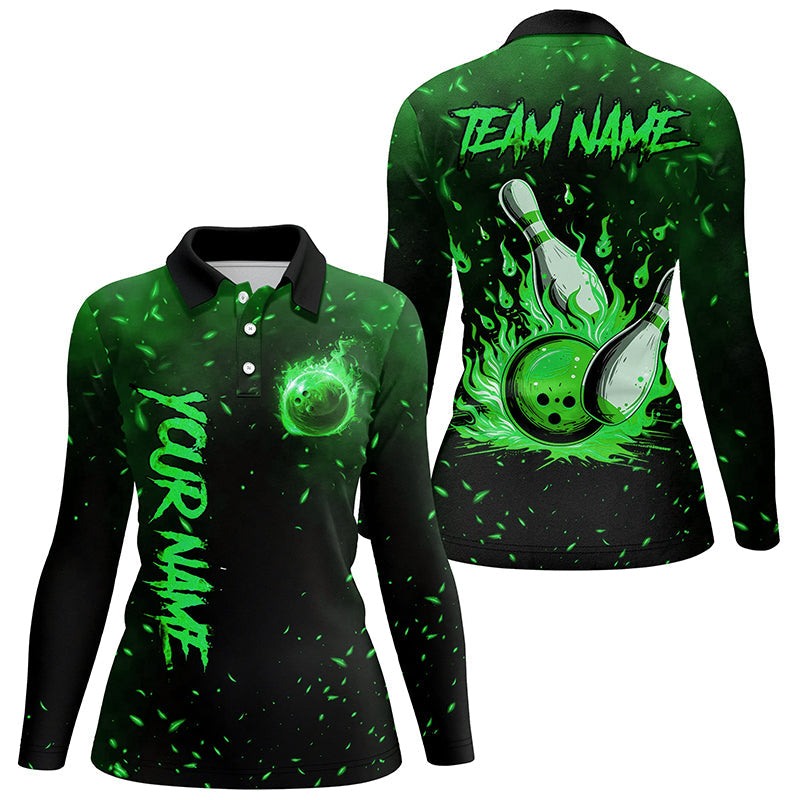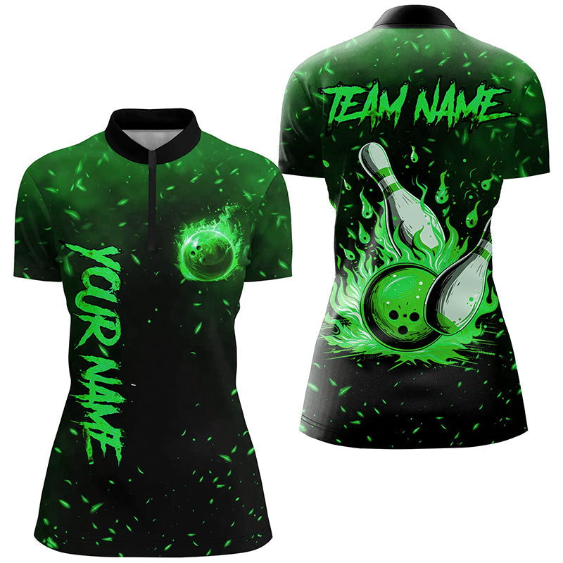 Green Flame Bowling Jersey For Women Custom Bowling Polo, Quarter-Zip Shirt for Team, Gift for Bowlers NQS8468