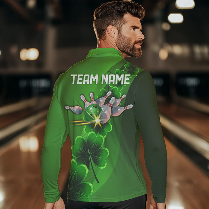 Green shamrock Lucky Bowling Polo, 1/4 Zip Shirt for Men Custom St Patrick Day Bowling Team Jerseys NQS9486
