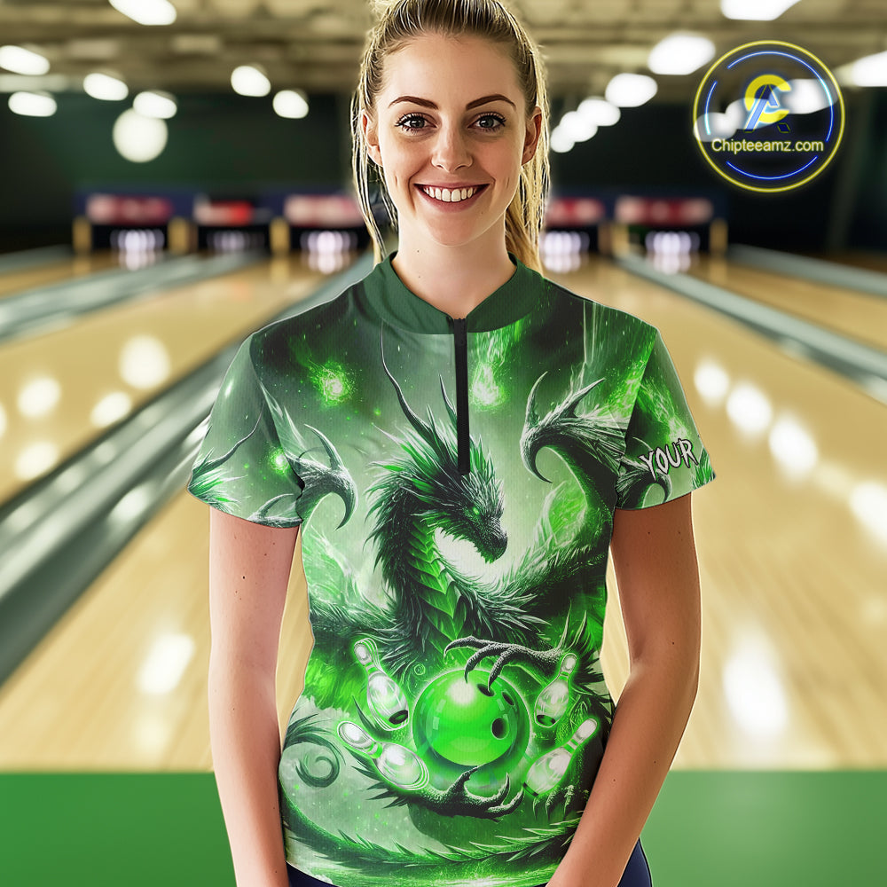 Personalized Green Lights Dragon Women Bowling Polo, 1/4 Zip Shirt Custom Team Bowling League Jersey NQS10199