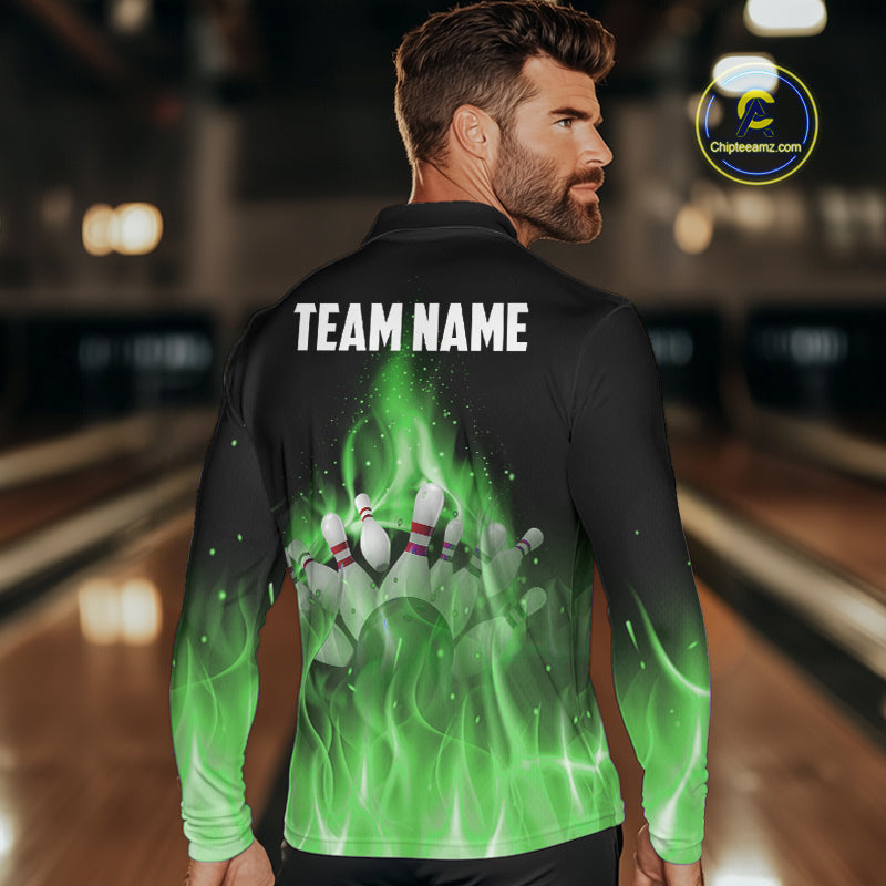 Personalized Mens Bowling Shirt Green flame Bowling Ball and Pins Team bowling jerseys for men Bowler NQS10472