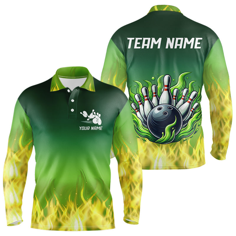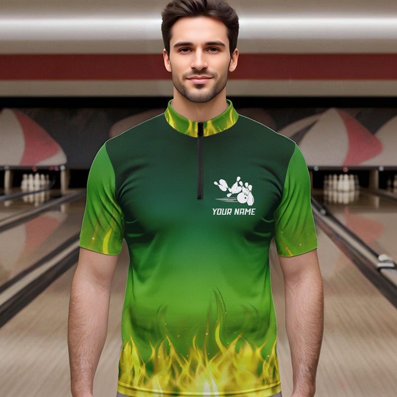 Personalized Yellow Green Flame Bowling Polo, Quarter Zip Shirts For Men Custom Team Bowling Jersey NQS9559
