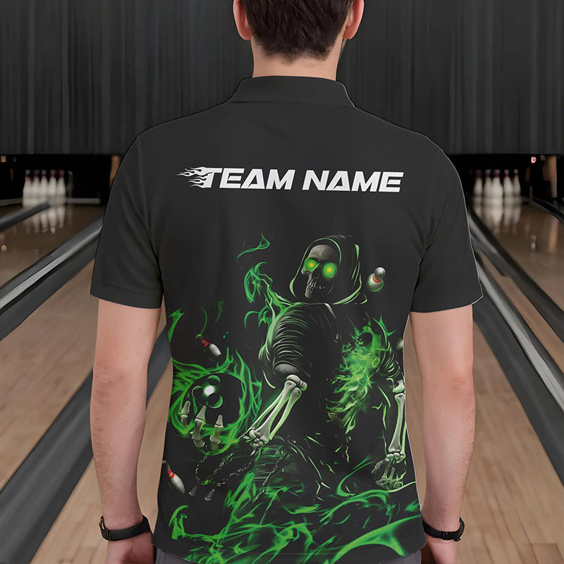 Custom Black And Green Flame Skeleton Bowling Polo Shirts For Men, Skull Bowling Jerseys IPHW8413