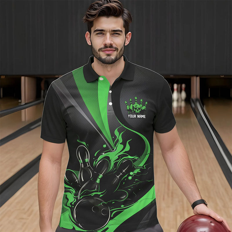 Custom Black And Green Flame Bowling Polo Shirts For Men, Fire Bowling Team Shirt IPHW8540
