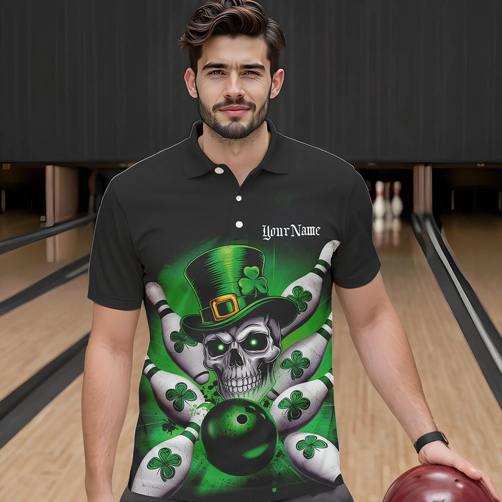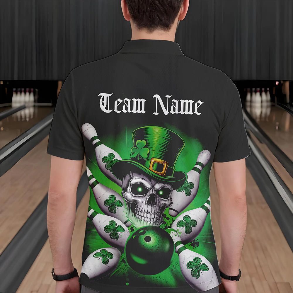 Custom Black And Green Lucky Clover St Patricks Day Skull Bowling Team Polo Shirts For Men IPHW8593