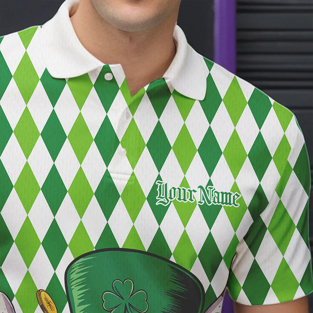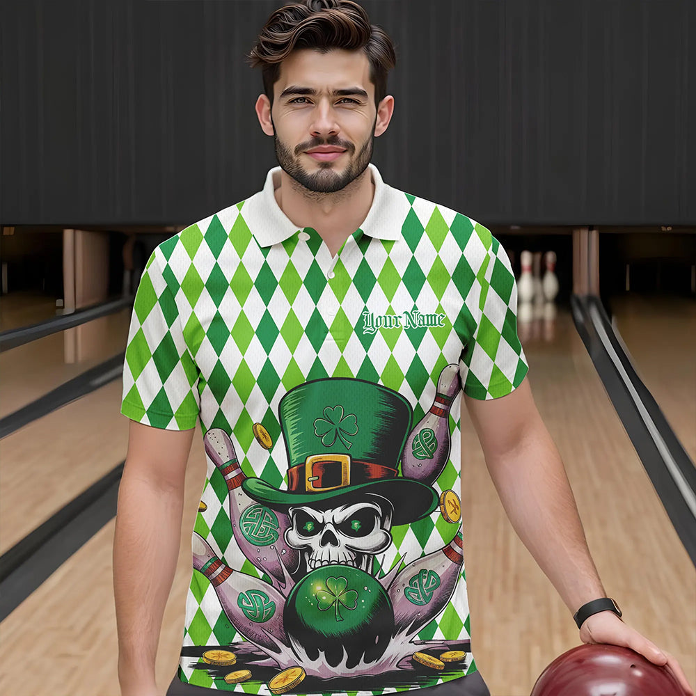 Custom White And Green St Patricks Argyle Skull Bowling Polo Shirts For Men, Bowling Jerseys IPHW8596