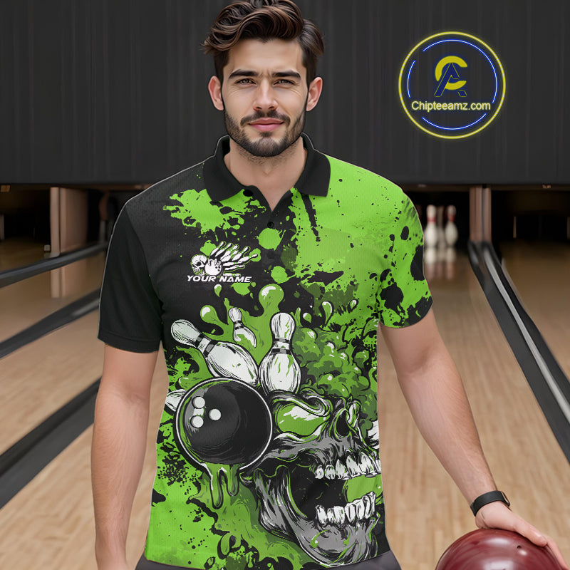 Custom Black And Green Splatter Skull Bowling Team Men Polo Shirt, Halloween Outfit IPHW9728