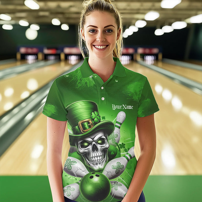 Custom Green Leprechaun Skull St Patricks Bowling Polo Shirt For Women, Lucky Bowling Shirt IPHW8595