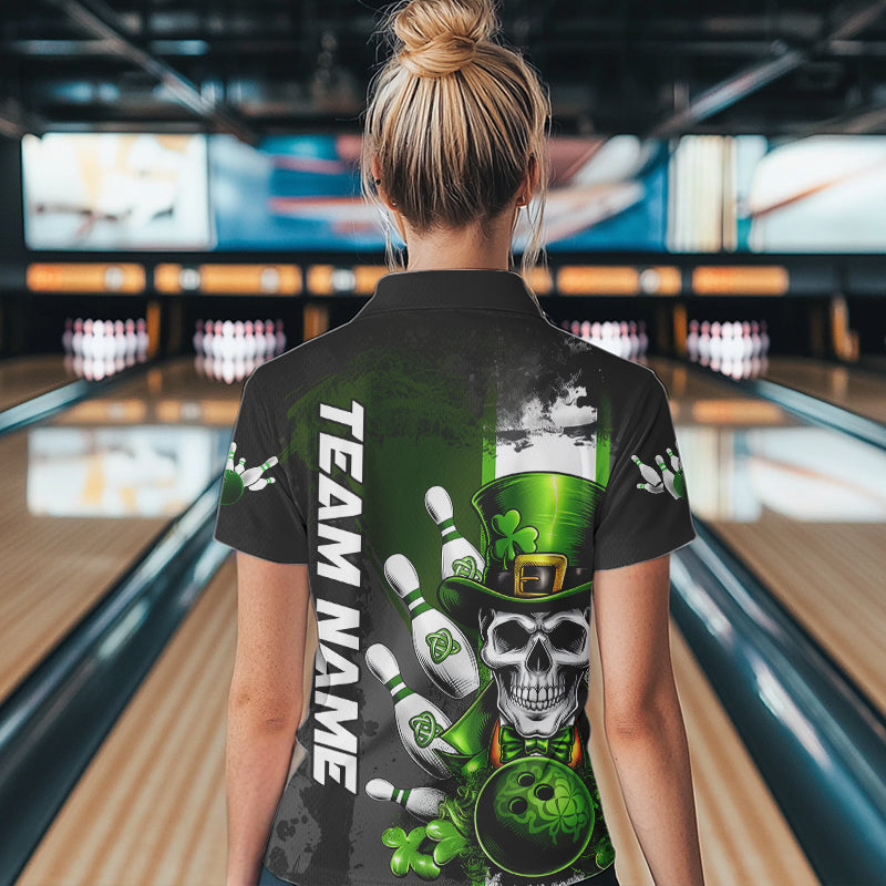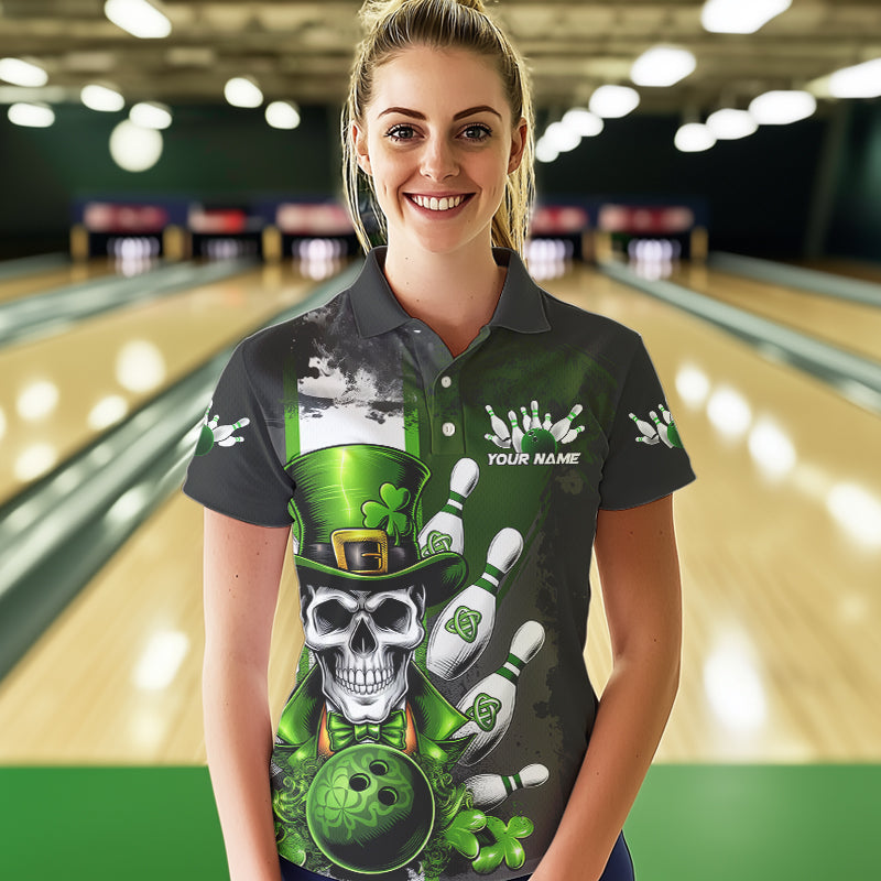 Custom Black And Green Lucky Clover St Patricks Day Skull Bowling Team Polo Shirt For Women IPHW8597