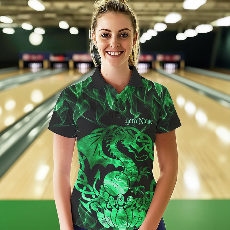 Custom Green Fire Flame Viking Dragon Bowling Women Polo Team Shirts, Celtic Bowling Shirts IPHW8875