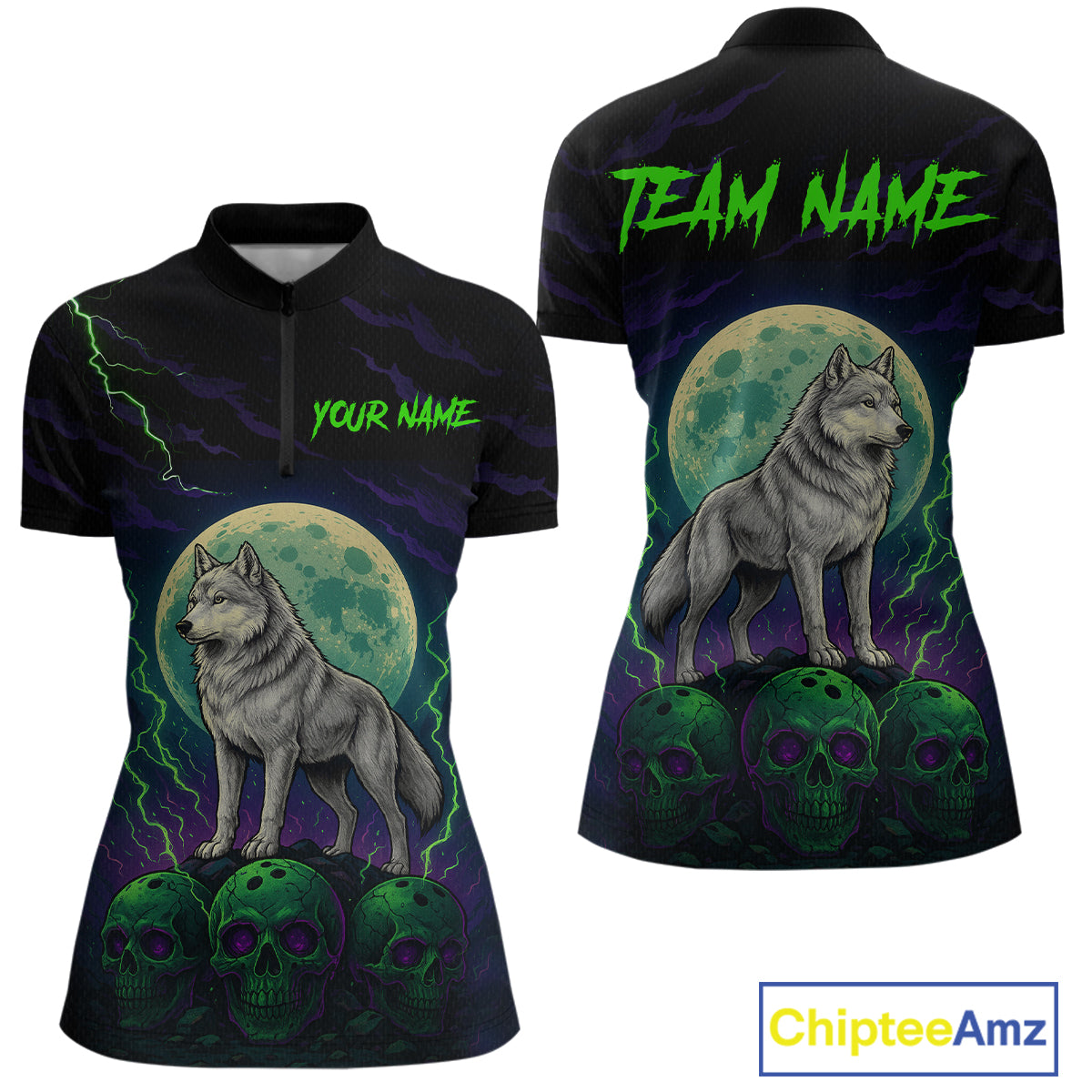Purple And Green Wolf & Skull Bowling Team Shirt for Women Custom Bowling League Jersey Bowling Unisex QZT732