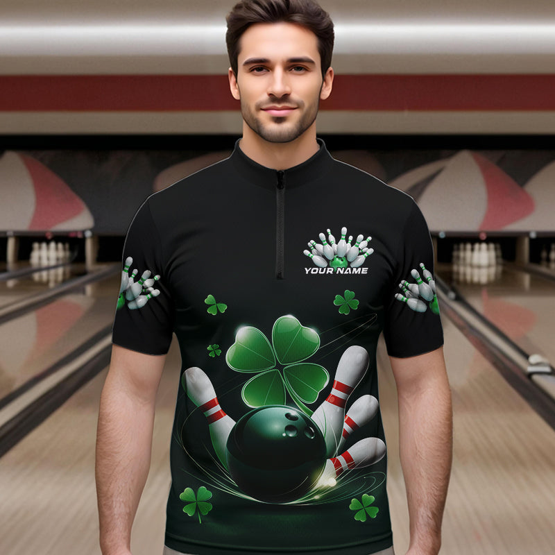Custom Green Shamprock Saint Patricks Bowling Quarter-Zip Shirts For Men, Lucky Bowling Team Shirt IPHW8571