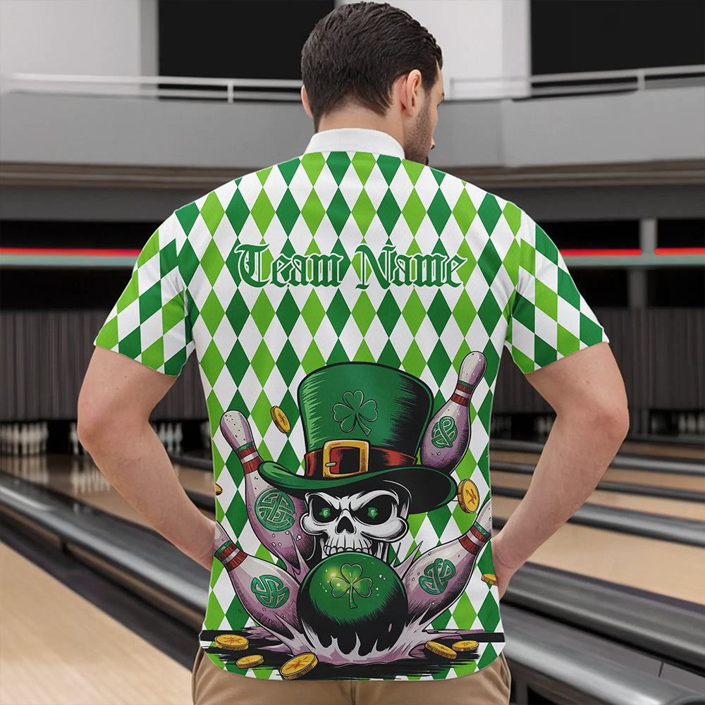 Custom White And Green St Patricks Argyle Skull Bowling Quarter-Zip Shirts For Men, Bowling Jerseys IPHW8596