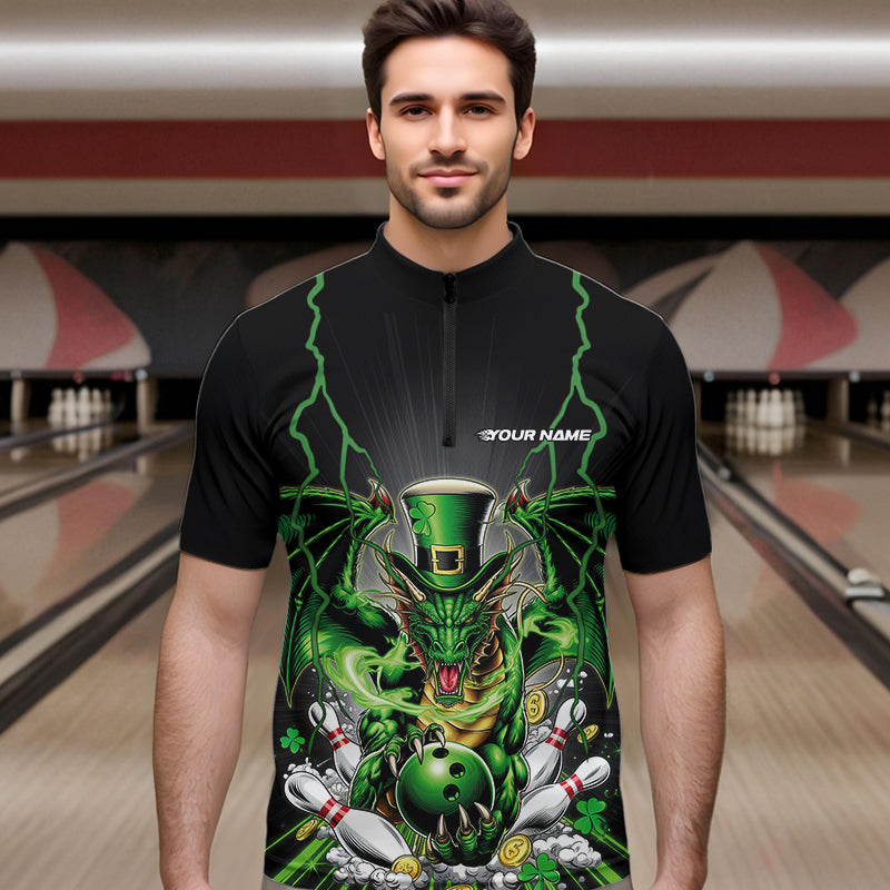 Custom Black And Green St Patricks Dragon Bowling Quarter-Zip Shirts For Men, Lucky Dragon Bowling IPHW8609