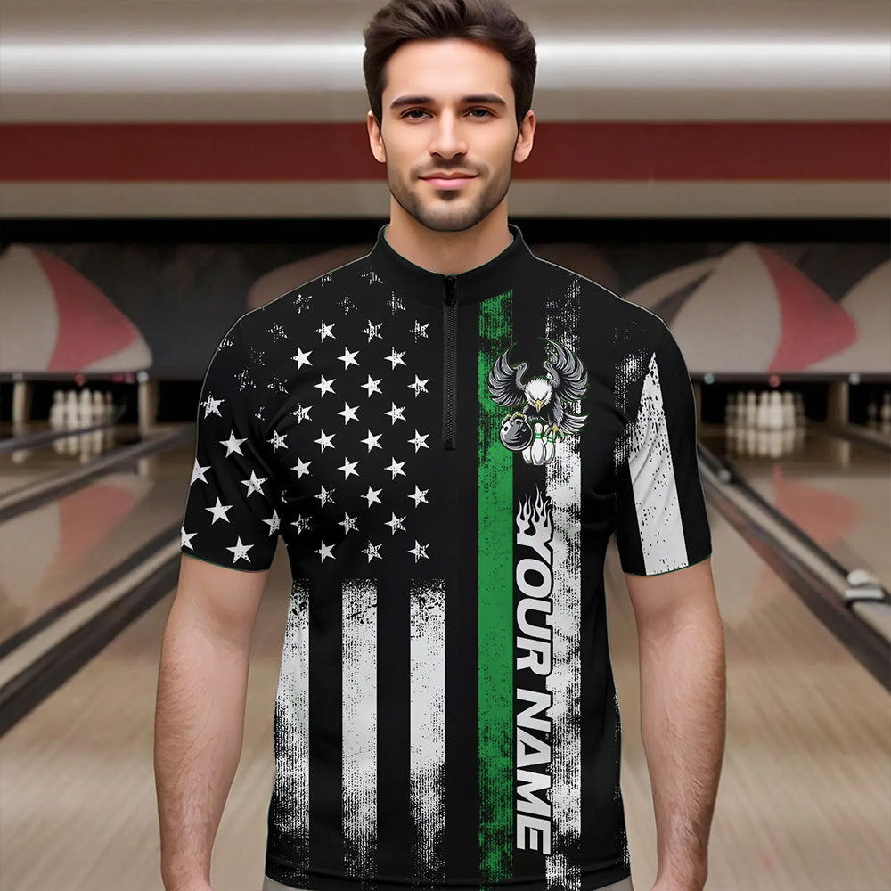 Custom Green Thin Line American Flag Eagle Bowling Men Quarter-Zip Shirts, Patriotic US Bowling IPHW8737