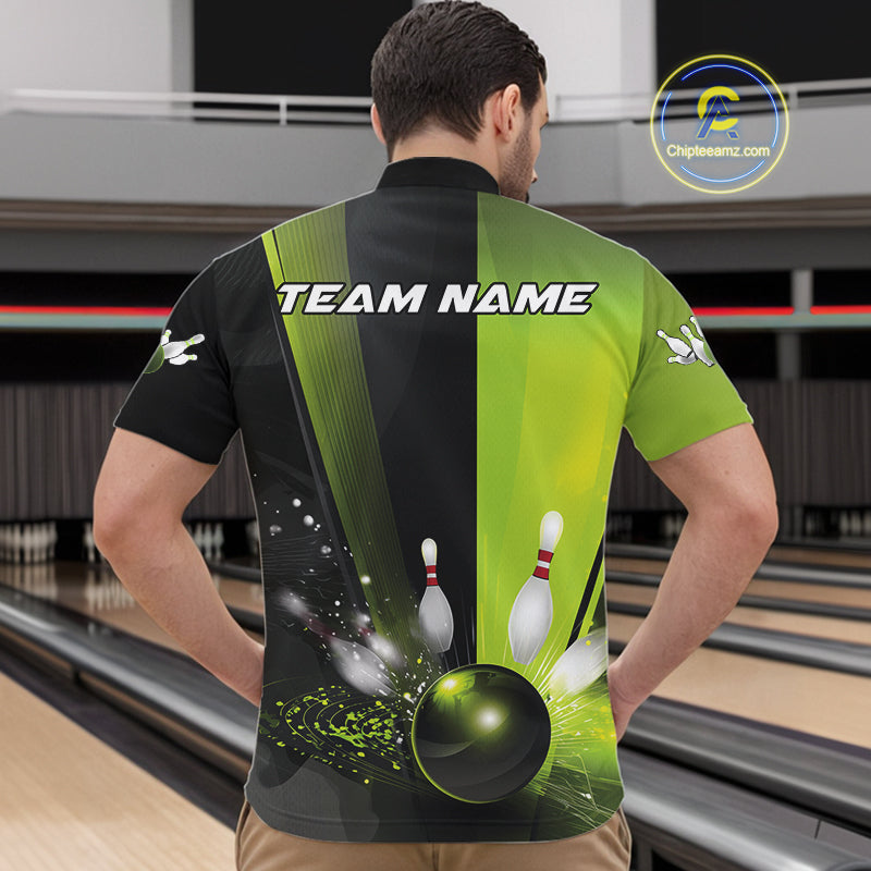 Custom Black And Green Bowling Jerseys, Glowing Motion Graphic Bowling Men Quarter-Zip Shirt IPHW9443