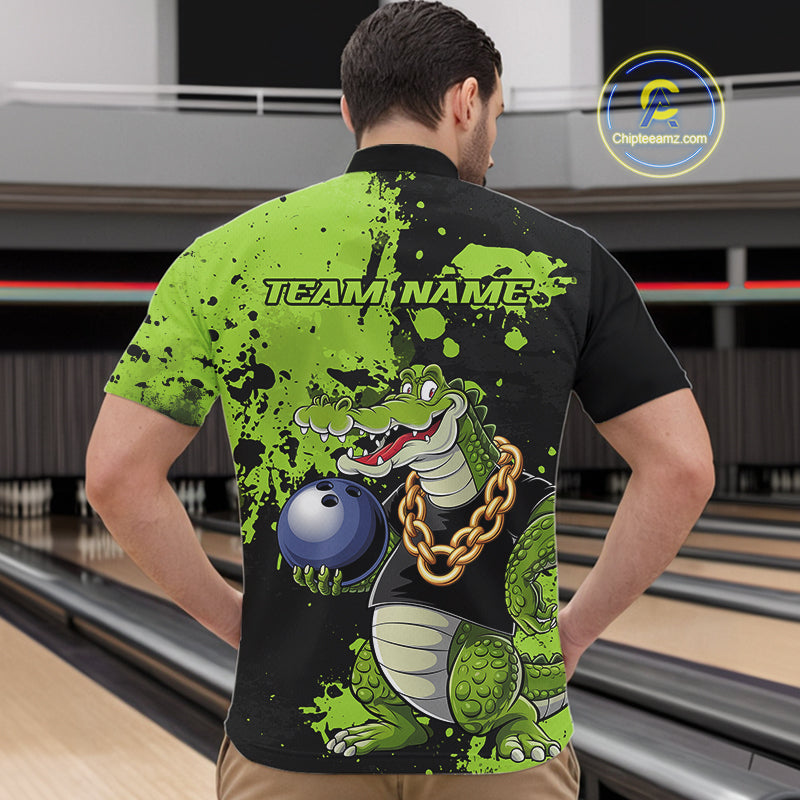 Custom Green Splatter Funny Alligator Bowling Men Quarter-Zip Shirts, Bowling Team Shirts IPHW9921