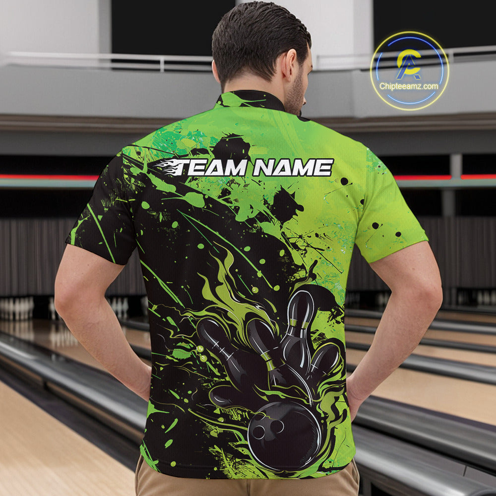 Custom Green Flame Bowling Men Quarter-Zip Shirts, Splatter Bowling Team Tournament Shirt IPHW9934