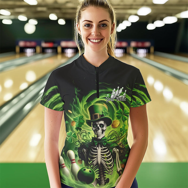 Custom Green St Patricks Day Skull Womens Bowling Quarter-Zip Shirt, Shamrock Bowling Shirt IPHW8376