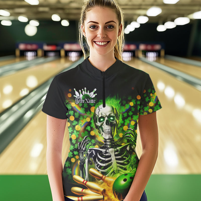 Custom Green Skull Saint Patrick Day Womens Bowling Quarter-Zip Shirt, Shamrock Bowling IPHW8378