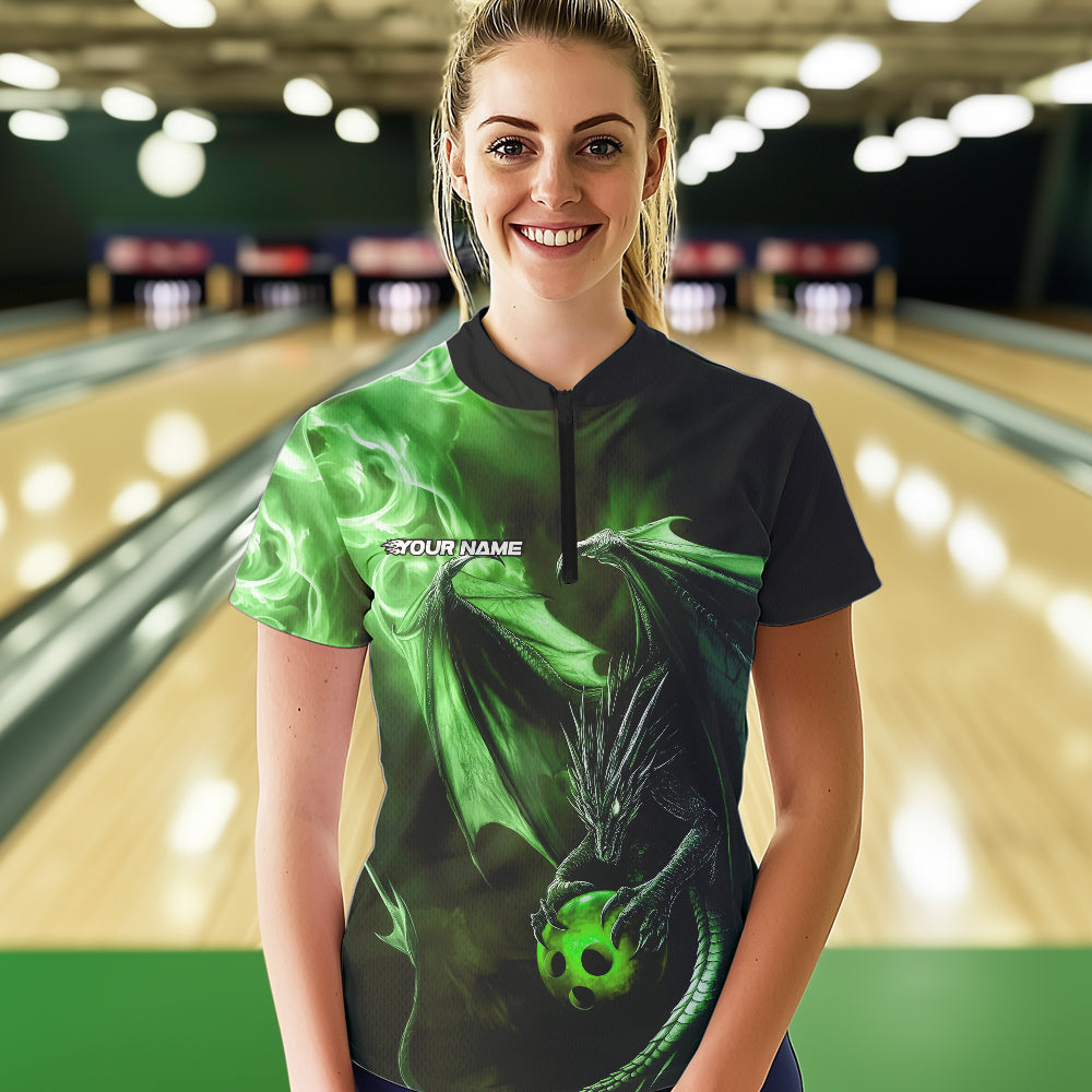 Custom Black And Green Flame Dragon Bowling Women Quarter-Zip Shirt, Dragon Bowler Jersey IPHW8965