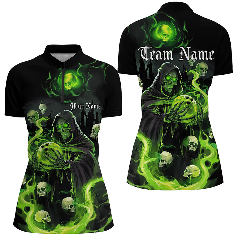 Black And Green Flame Grim Reaper Custom Halloween Ladies Bowling Shirts, Bowlers Outfits IPHW7611