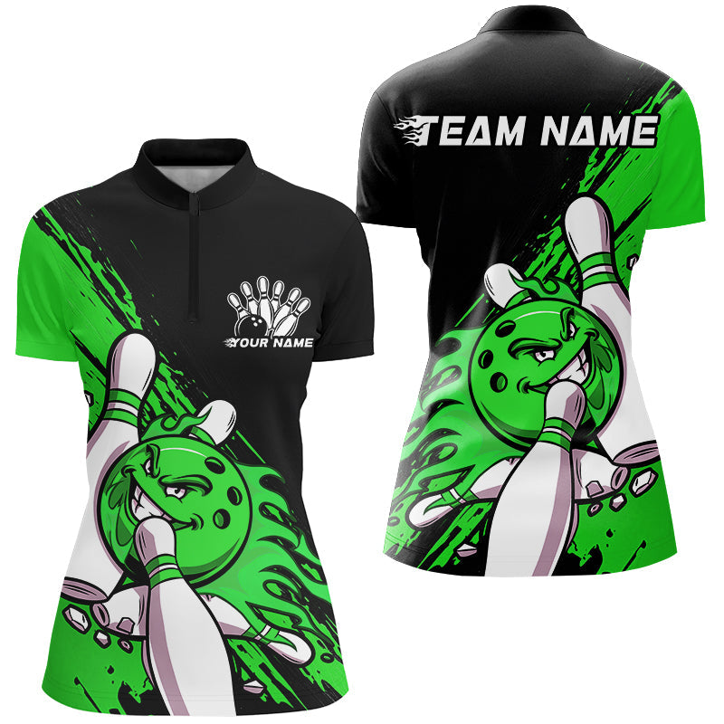Black And Green Custom Funny Ladies Bowling Shirts, Flame Bowling Team Shirt Bowlers Outfit IPHW7621