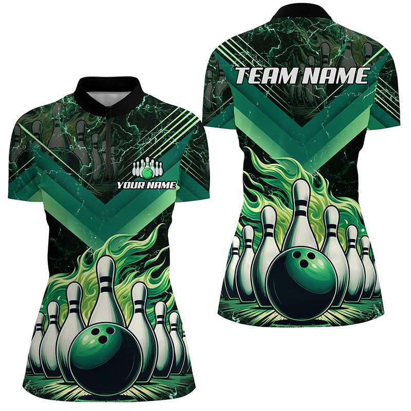 Womens Bowling polo, quarter zip shirts Custom Flame bowling team Jerseys, gift for bowlers | Green NQS7674