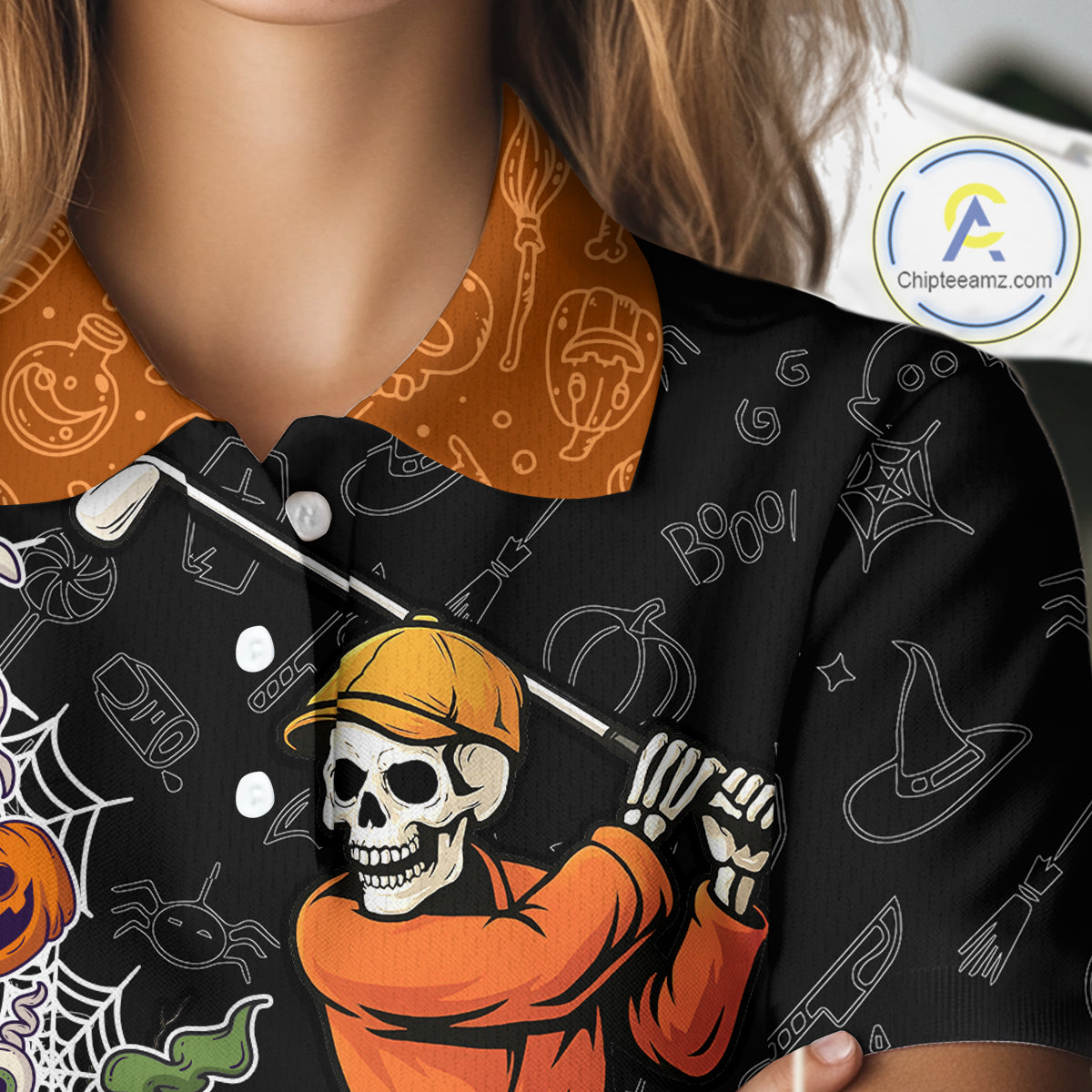 Halloween Skull Playing Golf Women Golf Polo Shirt Custom black & orange Halloween mens golf outfit NQS10341