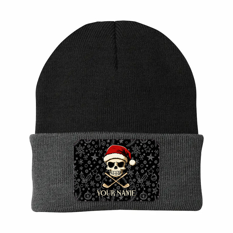 Funny Christmas Skull Golf Knit Beanie Hat, Custom Rectangle Patch Golf Beanie Hat, Xmas Golf Gifts NQS10783